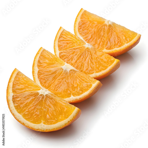 An orange sliced into even wedges, each wedge showing its juicy, segmented interior.