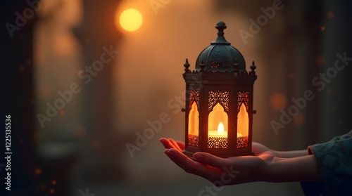 An ornate Arabic lantern with a glowing candle held in hand, creating a festive ambiance. Perfect for a greeting card or invitation celebrating the holy month of Ramadan Kareem.