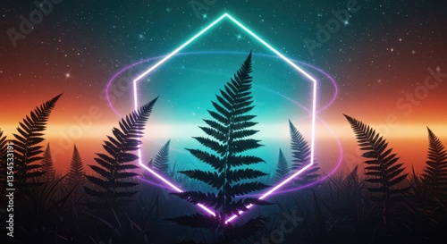 An otherworldly retro scene with silhouetted ferns under a teal and orange cosmic sky, a swirling violet rings, and a neon white pentagon frame emitting soft sparks