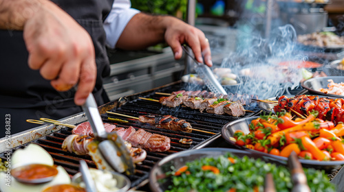 an outdoor barbecue station with a chef grilling various meats, surrounded by fresh ingredients and sauces
