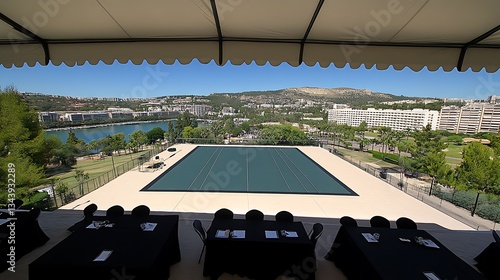 sky, blue, green, water, landscape, tree, grass, building, architecture, urban, city, view, horizon, sunny, day, summer, area, ground, edge, shadow, structure, event, reception, table, chair, seating, cover, textile, clothes, dark, presentation, space, border, surface, field, park, perspective, distance, light, design, decoration, shelter, awning, scenery, background