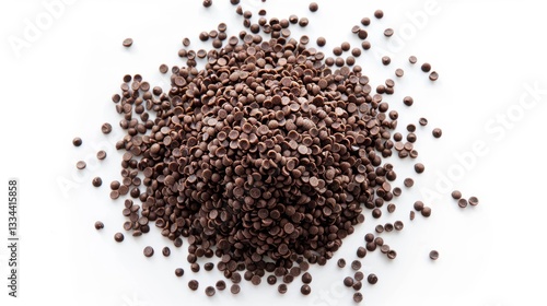 An overhead close up of a pile of chocolate chips isolated on a white seamless background, perfect for culinary uses.
