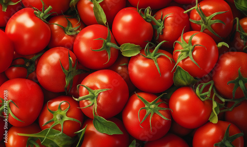 An overhead, full-frame close-up of a large pile of fresh, vibrant red tomatoes with green stems and leaves.