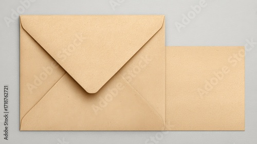 An unfolded tan invitation envelope sits next to a matching blank card on a light gray surface creating a simple stationery presentation.