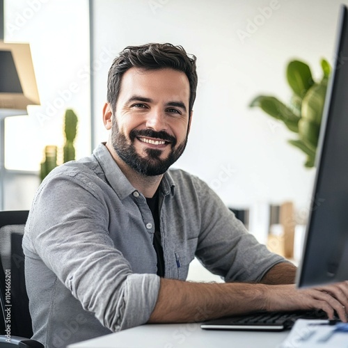 An upbeat white man is at his computer in a stylish, illuminated office. He is a self-assured human resources agent, smiling joyfully as he collaborates with his coworkers online.