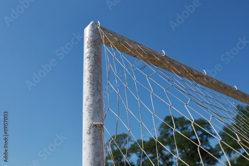 An upper corner of a football goal from behind, with trees and a blue sky in the background. The concept for amateur football or local competitions.