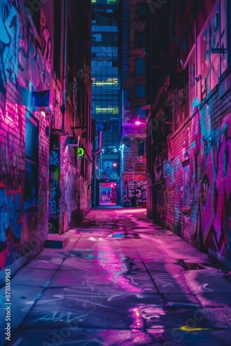 An urban alleyway covered in neon graffiti, with vibrant, street art.