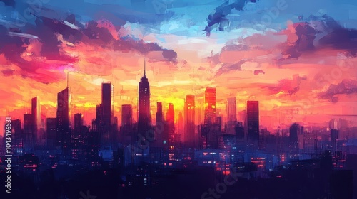 An urban landscape at sunset with silhouettes of skyscrapers, vibrant colors reflecting off the glass windows, and soft clouds scattered across the sky