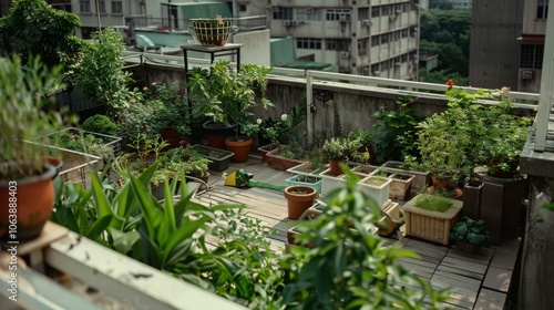 An urban rooftop garden flourishes with diverse potted plants, creating a vibrant oasis amidst towering buildings.