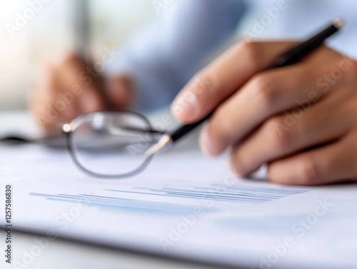 business, graph, pen, goggles, document, analysis, chart, office, work, hand, report, financial, planning, strategy, datum, information, paper, closeup, writing, table, desk, reading, research, corporate, finance, accounting, job
