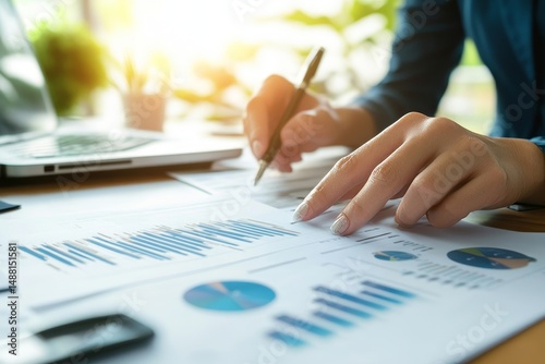 Analyzing financial charts with laptop and pen in bright office environment for business planning