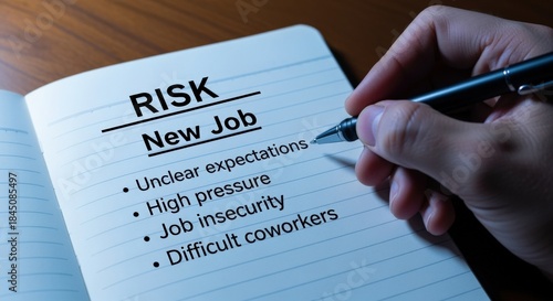 new, risk, job, career, change, expectation, pressure, insecurity, difficult, co-worker, analysis, assessment, evaluation, consideration, challenge, problem, uncertain, stress, management, employment, opportunity, planning, strategy, decision, solution, work, businessman, human, resource, hr, hiring, recruitment, occupation, manpower, professional, notebook, text, writing, hand, pen