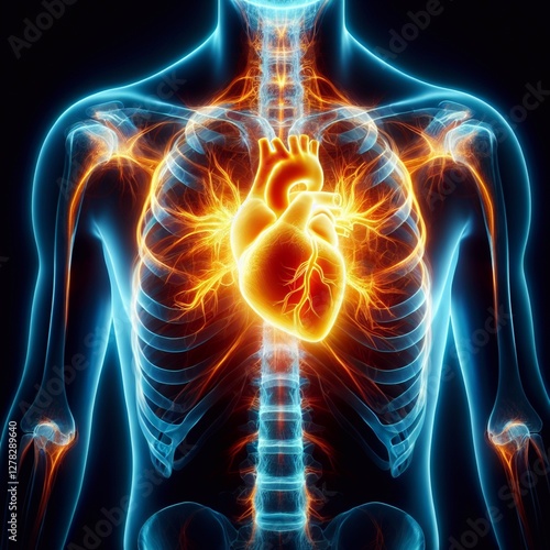 Anatomical Heart: An illuminating image showcases the human heart within the ribcage, highlighting its vital role in circulation and health.