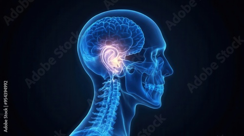 Anatomical highlighting the human brain and ear in a stunning blue glow against a dark background.