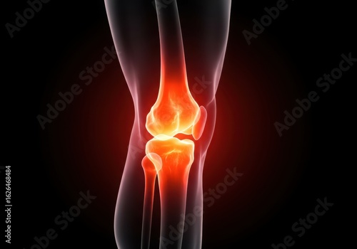 knee, anatomy, human, joint, pain, inflammation, medicals, illustration, orthopedics, bone, ligament, tendon, cartilage, injury, health, skeletal, system, leg, body, red, glow, orange, dark, background, detailed, realistic, three-dimensional, rendering