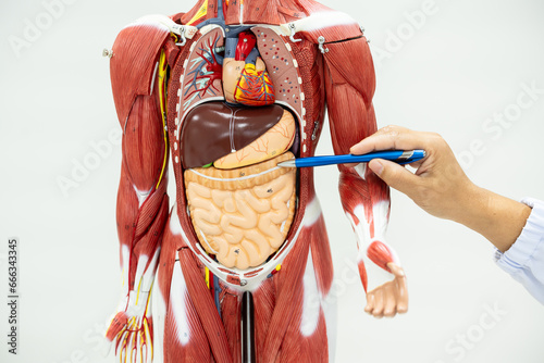 Anatomy human body model isolated on white background.Part of human body model with organ system.Human abdominal model.Doctor explain to patient for medical treatment.