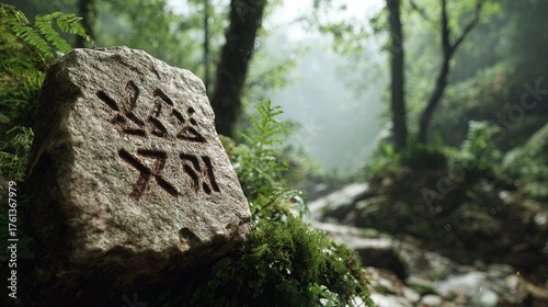 stone, rock, ancient, carved, inscription, rune, moss, fern, forest, timberland, nature, trail, path, mystery, history, old, weathered, wilderness, green, foliage, tree, misty, fog, damp, humid, mysterious, sacred, symbol, heritage, archaeology, exploration, discovery, mystical, storytelling, legend, folklore, secret, enigma, forgotten, antique, primitive, rugged, textured, wild, serene, peaceful, enchanting, inscription