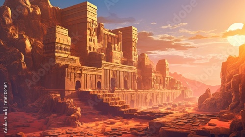 Ancient city buried deep within a desert or underwater realm. Depict its crumbling architecture, intricate statues, and the sense of wonder and mystery that surrounds this forgotten civilization