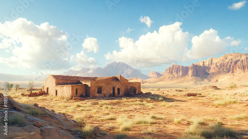 Ancient Desert Adobe Village in Arid Landscape Surrounded by Red Rock Formations - Traditional Architecture and Historic Settlement in Remote Desert Environment