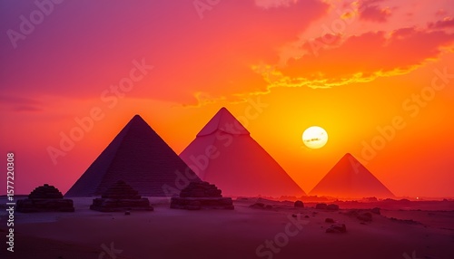 Ancient Egyptian Pyramids at Sunset: Vibrant Orange and Purple Hues