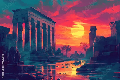 temple, sunset, sun, palm, tree, sky, cloud, ruin, ancient, egyptian, pharaoh, architecture, column, desert, water, dusk, evening, gold, red, orange, pink, blue, teal, artwork, digital, art, painting, illustration, fantasy, mystical, mysterious