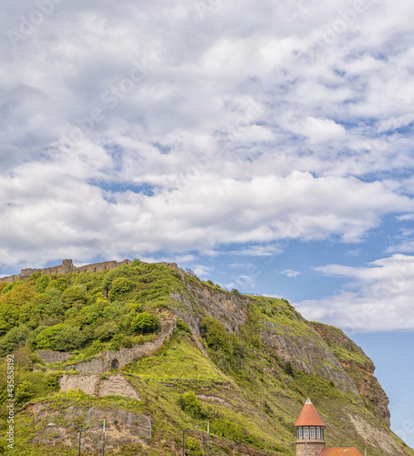 east coast, north sea, scarborough, britain, yorkshire, arch, architecture, archway, block, building, castle, cliff, cloud, coast, coastal, conical, foliage, grass, heritage, hill, hillside, historic, history, landscape, mediaeval, netting, old, roof, round, sheer, sky, skyline, infused, stone, tower, tree, uphill, wall