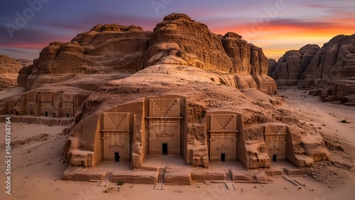 tomb, sandstone, cliff, desert, saudi, arabia, architecture, ancient, aerial, drone, twilight, sunset, archaeology, heritage, rock, history, culture, travel, tour tourism, landscape, majestic, serene, ocher, purple, orange, shadow, carving, historical building, archaeologic, site