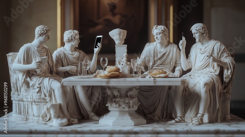 ancient, roma, sculpture, marble, dining, classical, art, smartphone, conversation, history, meal, culture, antiquity, roman, figure, gathering, decor, modern, technology, table, setting, representation, elegance, craftsmanship, heritage, historical, artwork, leisure, style, tradition, social, interaction, fine, design, architecture, communication, timeless, vintage, aesthetic, relaxation, luxury, exhibition, museum, expression, food, drink, grape, bread, elegant, attire