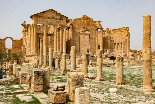 Ancient Roman heritage, remains of ancient majestic capitol forum in city of Sufetula in Tunisia. Architectural monument, historical landmark, Roman Forum of Sbeitla