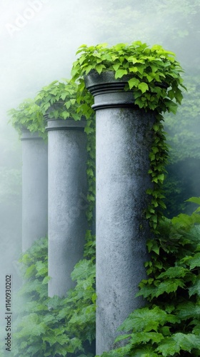 ancient stone columns overgrown with moss and ivy, standing in a dense