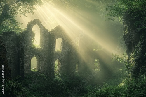 ruin, forest, light, fog, verdant, mystic, serene, ancient, nature, stone, calmness, beauty, past, present, meditation, peace, chiaroscuro, relaxation, history, enchantment, twilight, elevation, gothic, relic, overgrowth, archaeologic, arch, foliage, vibe, scenery, mythical, harmony, solitude, impermanence, reverie, abandonment, quietude, transcendence, inspiration, bequest, warm, greenery, natural, breathtaking