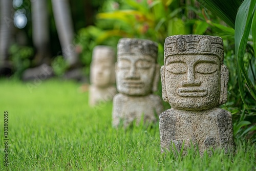 stone, statue, aligned, garden, foliage, ancient, tropical, sculpture, exterior, artifact, archaeology, cultural, lawn, carving, art, tradition, grass, plant, nature, detail, design, alignment, symmetric, decoration, historic, old, texture, spirituality, symbolic, mysterious, iconic, figure, head, facial, feature, serenity, peaceful, tranquil, heritage, background, environment, landscaping, atmosphere, weathering, timeless, history