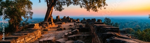 Ancient temple ruins overlooking a breathtaking view. The scene is illuminated by the warm light of the sunrise, with a big tree