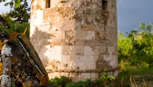 tower, ancient, stone, wall, snail, tree branch, tree, nature, sunlight, weathered, rustic, old, closeup, detail, natural, background, outdoors, light, shadow, texture, pattern, masonry, grass, vegetation, landscape, ruin, structure, wildlife, insect, creature, earth, environment, organic, exterior, historic, building, architecture, foliage, sunny, soft, sharpened, blurred, detail, closeup, rural, calm