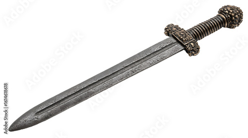 sword, viking, ancient, weapon, mediaeval, battle, warrior, historical, blade, steel, metal, hilt, ornate, decoration, craftsmanship, artifact, relic, combat, defense, offence, heroic, legendary, fantasy, epic, adventure, history, museum, collection, display, isolated, cut-out, transparent, background, copy, space, prop, costume, reenactment, power, strength, heritage, culture, norse, scandinavian, iron, dagger, knife, armoury, weaponry