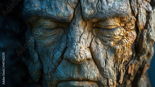 face, aged, weathered, wood, bark, sculpture, art, portrait, human, old, ancient, nature, tree, texture, detail, closeup, carved, stone, wisdom, time, wrinkle, line, grey, brown, gold, light, shadow, depth, melancholy, peaceful, still, serene, eye, nose, mouth, expression, intricate, artistic, realistic, rustic, rough, history, vintage, powerful, spiritual, wooden, relief