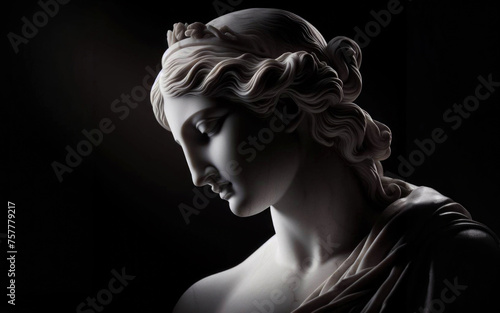 Ancient white marble sculpture head of young woman. Statue of sensual renaissance art era woman antique style