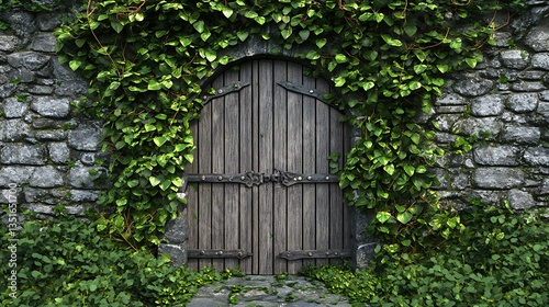door, wooden, wall, stone, ivy, leaf, green, plant, gate, entrance, archway, old, ancient, rustic, vintage, mediaeval, fantasy, mystery, hidden, secret, passage, overgrown, nature, foliage, architecture, building, exterior, texture, detail, path, ground, grey, dark, metal, iron, gothic, growth, wild, enclosed, entranceway