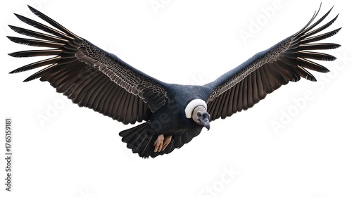 Andean condor, Vultur gryphus soaring with wings wide open, isolated on white background, majestic bird photography