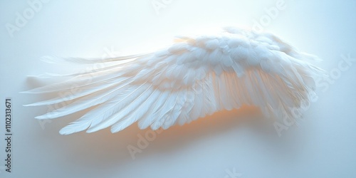 angelic feathered wing floating on a white background soft light and shadow contrast high detail