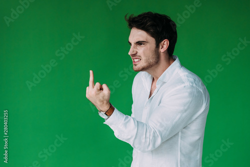 angry man in white shirt looking away and showing middle finger isolated on green