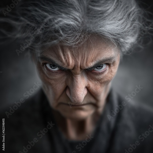 angry, woman, old, closeup, face, eye, wrinkle, hair, grey, dark, serious, portrait, focused, intense, expression, stern, powerful, close, dramatic, studio