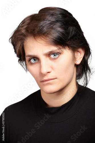 portrait, vertical, woman, female, 20s, 20, young adult, beautiful, beauty, angry, upset, furious, white, white background, isolated, missy, brunette, starring, depressed, caucasian, expression, face, serious, casual attire, natural, peaceful, person, 1, one person, colours, studio shot