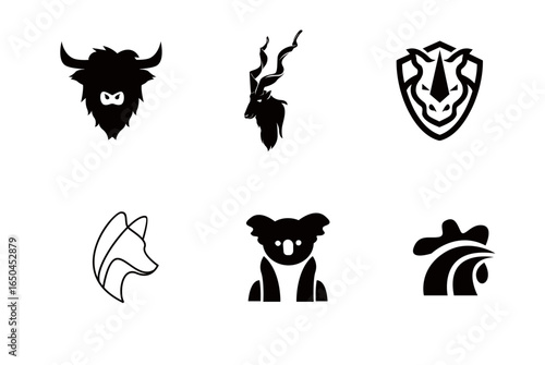 animal, head, silhouette, vector, icon, set, yak, kudu, rhino, fox, koala, rooster, logotype, emblem, black-and-white, design, wild, wildlife, nature, mammal, bird, line art, geometric, bold, modern, simple, stylised, illustration, graphic, art, template, print, symbol, signs, creative, zoo, animal kingdom, animal world, isolated, fauna, species