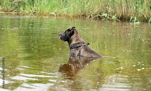 Animals. A large black dog of the Alabai breed sits wet in the river in the forest and waits for its owner.