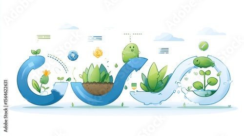 cycle, growth, plant, water, eco, environment, sustainable, organic, nature, circle, life, loop, illustration, design, cartoon, cute, fresh, green, blue, element, process, transformation, progress, development, renewable, circular, environmentally friendly, resilience, flourish, evolve, nourishment, rebirth, recycling, biodiversity, ecosystem, regenerative, healthy, vibrant, freshness, renewal