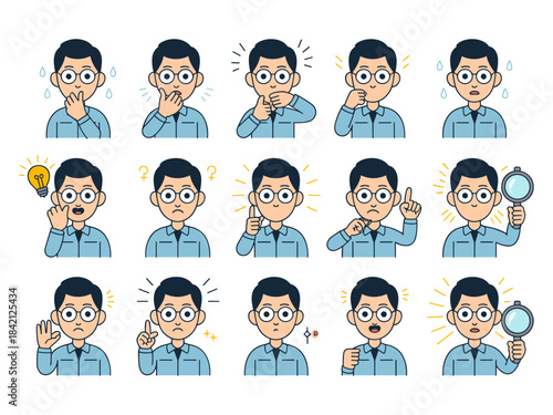 Animated Man Expressing Diverse Emotions and Ideas: A Vector Illustration Set for Business, Education, and Creative Projects (cartoon, character, thinking, doubt, eureka, confused, curious, solution,
