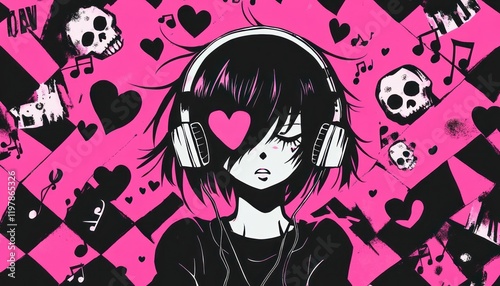anime, girl, music, earphones, nubes, skull, pink, pattern, gothic, manga, style, cute, illustration, background, cartoon, character, design, graphic, drawing, artwork, art, poster, emo, teenage, young, teenage, youth, fashion, trendy, love, dark, musical, tune, song, rocker, alternative, pop, punk, edgy