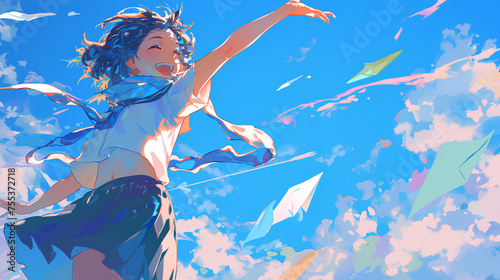 anime girl wearing a floating red scarf, sky background illustration