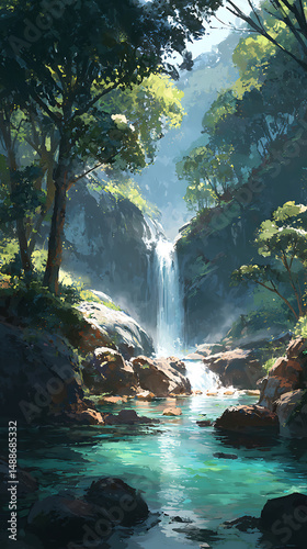Anime Manga Illustration of a Serene Waterfall in a Mystical Forest